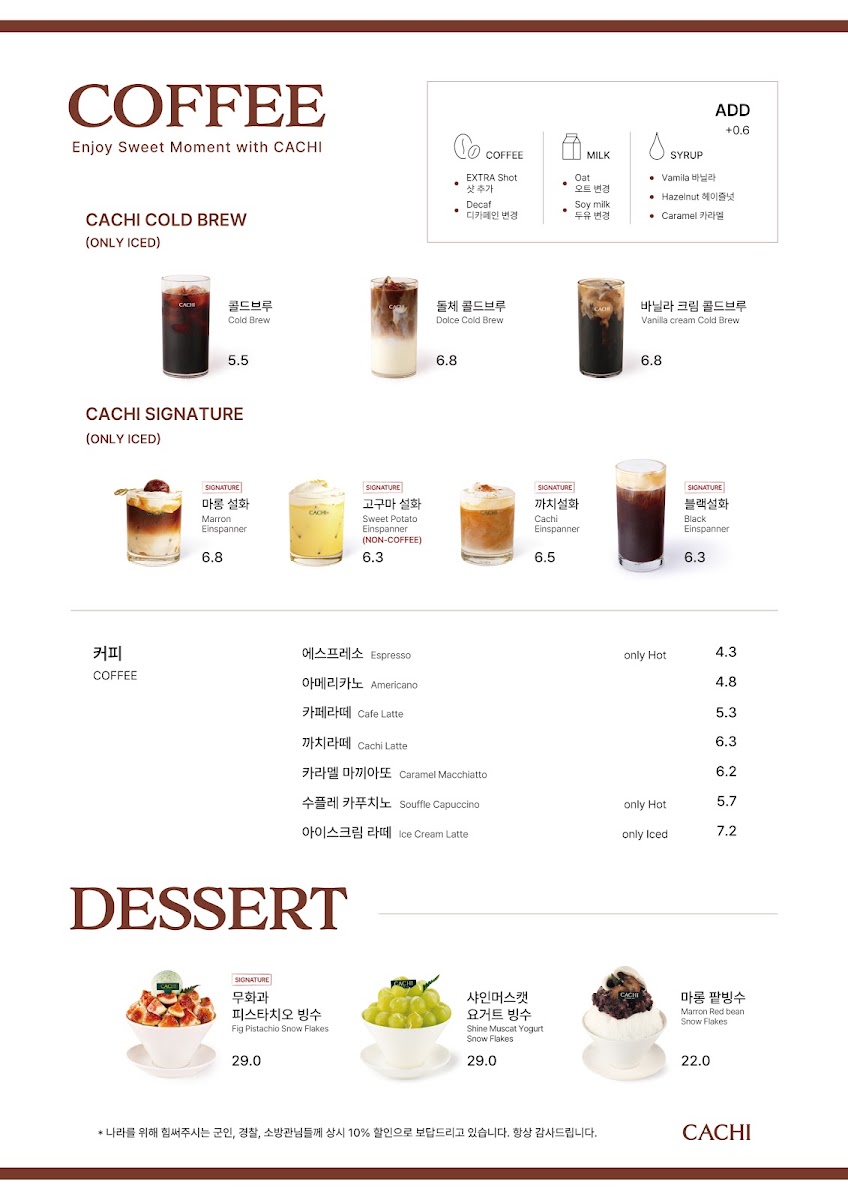 For a sweeter option, dive into the Shine Muscat Yogurt Shaved Ice (₩6,800), topped with luscious, juicy muscat grapes that add a burst of flavor atop a bed of creamy yogurt ice. It's a must-try for anyone seeking a cool respite from the bustling city. The atmosphere at CACHI is simply delightful, with its laid-back vibe that encourages you to relax, take a deep breath, and indulge in the beauty surrounding you.